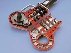 - Передача с большим усилением момента через 7 паралелльных передаточных валов, установленных на шарикоподшипниках, обеспечивающих постоянный уровень мощности передачи